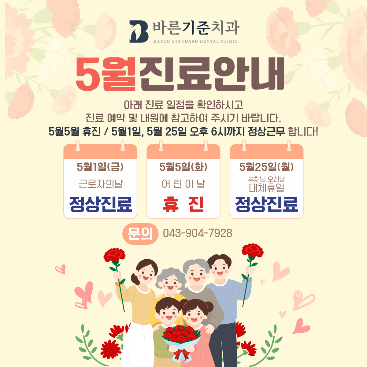 환자를 최우선으로 정성껏 진료하는 바른기준치과입니다. 26년 5월 진료일정 안내드립니다. 26년 5월 5일 어린이날로 병원 휴진입니다. 5월1일 근로자의날, 5월 25일 부처님오시는날 대체공휴일은 오후 6시까지 정상진료 합니다! 진료 일정 확인 후에 내원 부탁드립니다. 궁금하신점은 전화 & 카카오톡 문의주시면 친절하게 답변드리겠습니다. 감사합니다♥ |