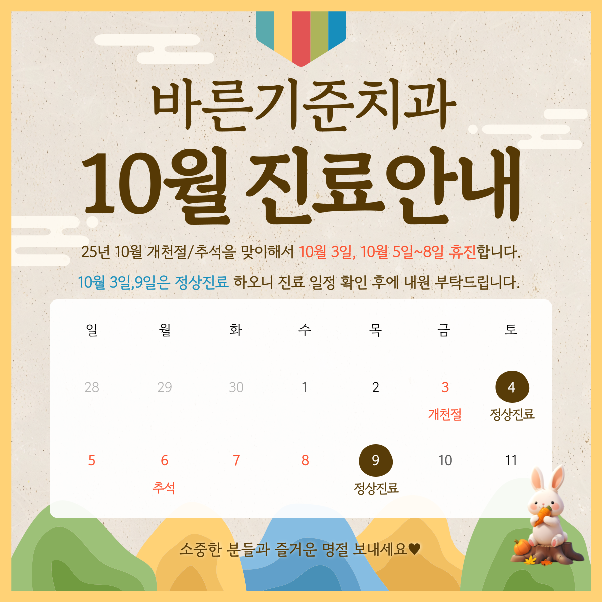 안녕하세요!😊 청주 바른기준치과입니다:) 바른기준치과 10월 진료안내 해드리겠습니다. 25년 10월은 개천절/추석을 맞이해서 10월 3일, 10월 5일~8일 휴진합니다. 10월 3일,9일은 정상진료 하오니 진료 일정 확인 후에 내원 부탁드립니다. (10월 9일은 오후 6시까지 진료합니다. 갑사합니다.)