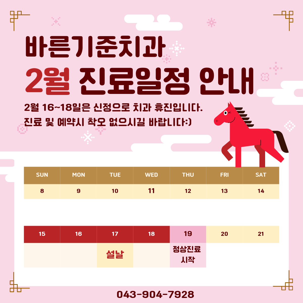 청주 바른기준치과입니다:) 바른기준치과 26년 2월 진료안내 해드리겠습니다. 26년 2월에는 신정을 맞이해서 2월 16일(월요일)~18일(수요일)까지 휴진합니다. 진료와 내원시 착오 없으시게 진료 일정 확인 후에 내원 부탁드립니다.